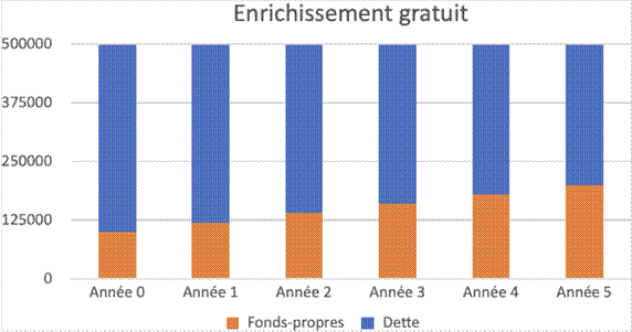 Après 5 ans, vos fonds propres passent à 200’000 CHF sans sortir un franc supplémentaire de votre poche, c'est ce que j'appelle l'enrichissement gratuit et voici à quoi cela ressemble graphiquement: