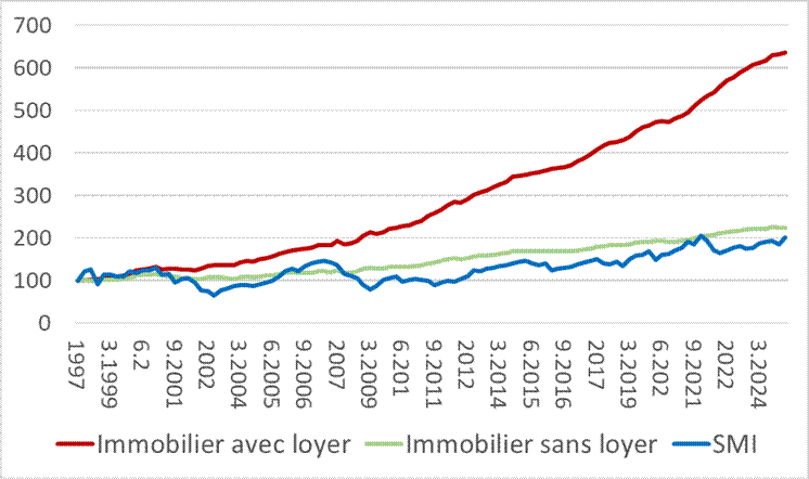 Je sais, je ressors ce graphique très souvent mais il est crucial. Cela compare le rendement des actions et de l'immobilier suisses sur presque 30 ans (base 100 en 1997):