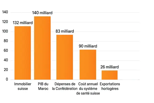 Ce secteur pèse plus de 2'000 milliards de francs suisses, en incluant les biens résidentiels, commerciaux et les terrains. En comparaison, le PIB suisse annuel tourne autour de 800 milliards. Autrement dit, la valeur du parc immobilier suisse est 2,5 fois supérieure à la production annuelle du pays.